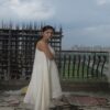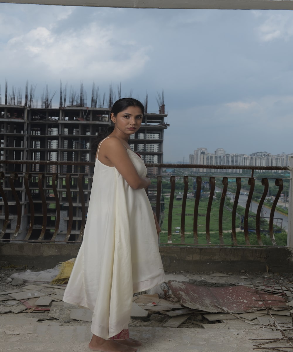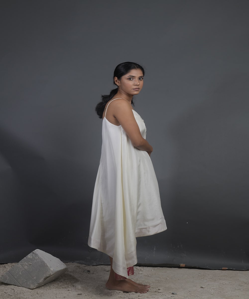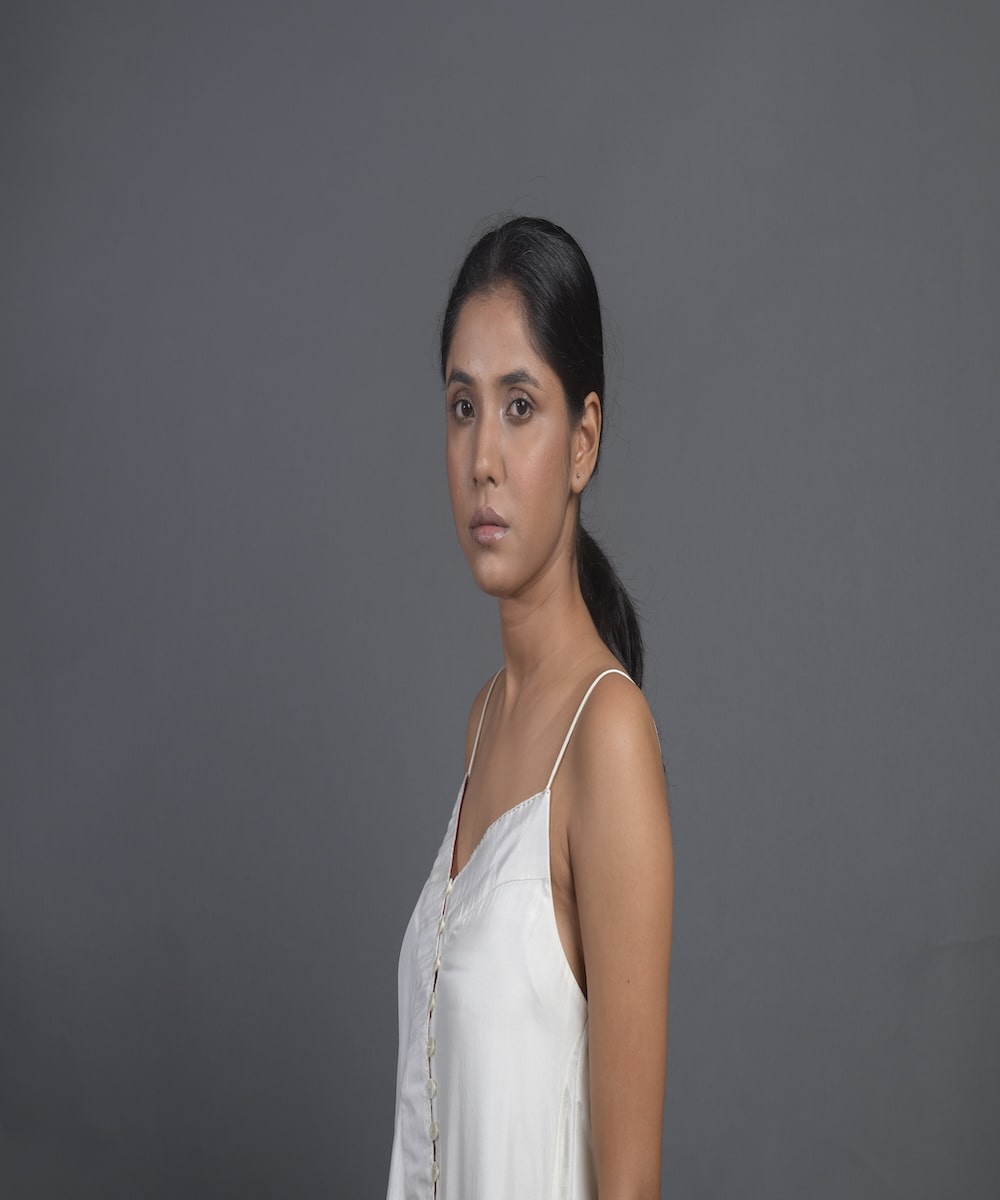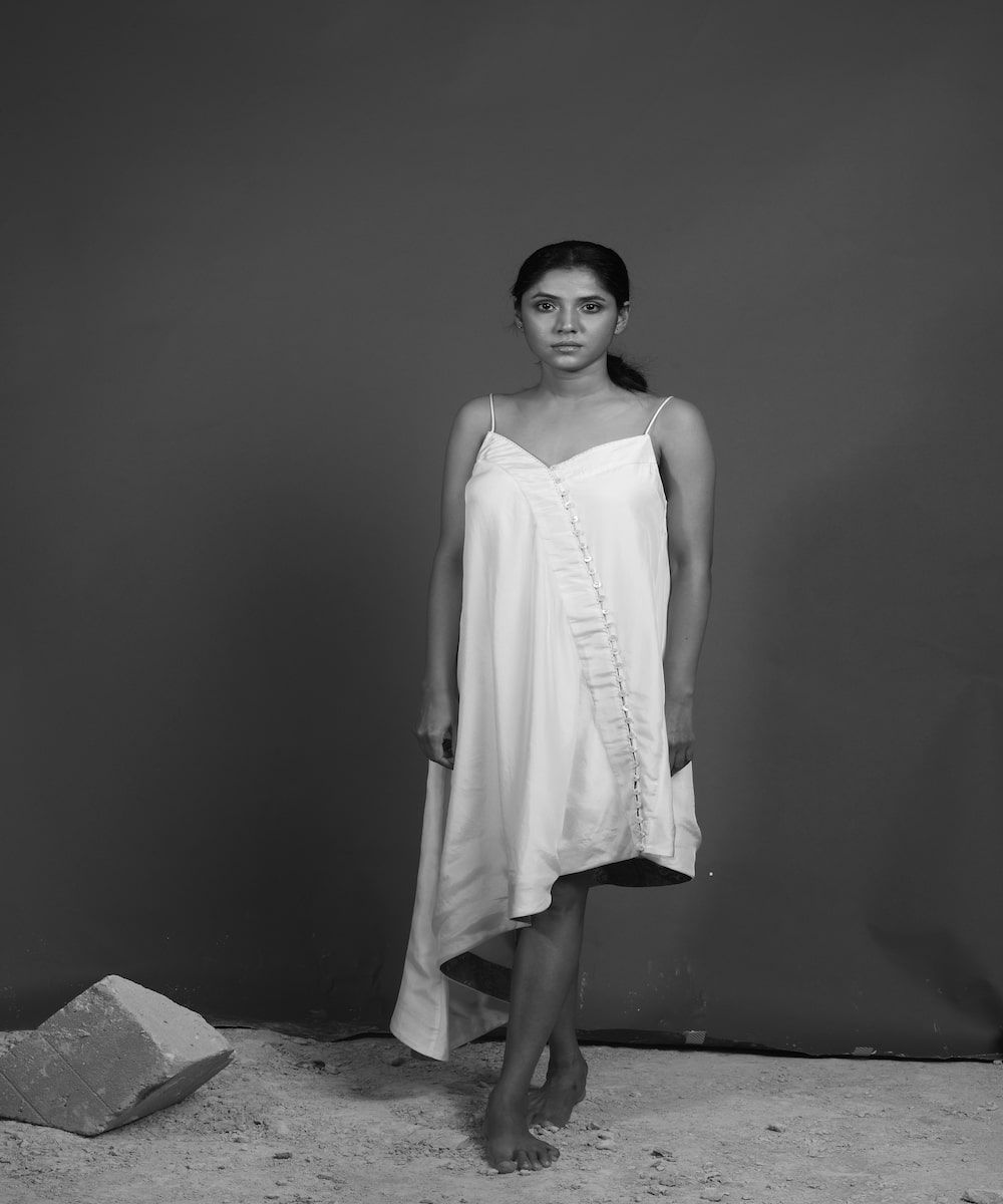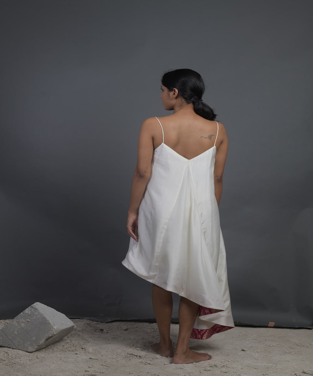 Asymmetric strappy dress in 100% habotai silk. Has a MOP buttons with loops with gold zari hand detailing.